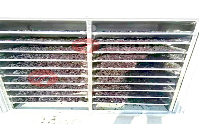 7.桑葚烘干機(jī)底部設(shè)有雙滑道,烘車裝滿烘盤后,可通過拖輪滑道,運(yùn)送到烘干機(jī)里面,固定底部,