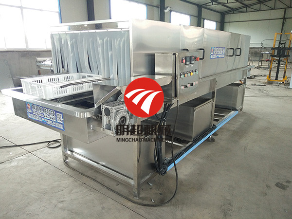 1. 清洗機一高壓噴淋沖洗為主要清洗方式,以約80℃熱堿水為主要洗滌劑,以約80℃熱水為主要清洗力進行清洗;
