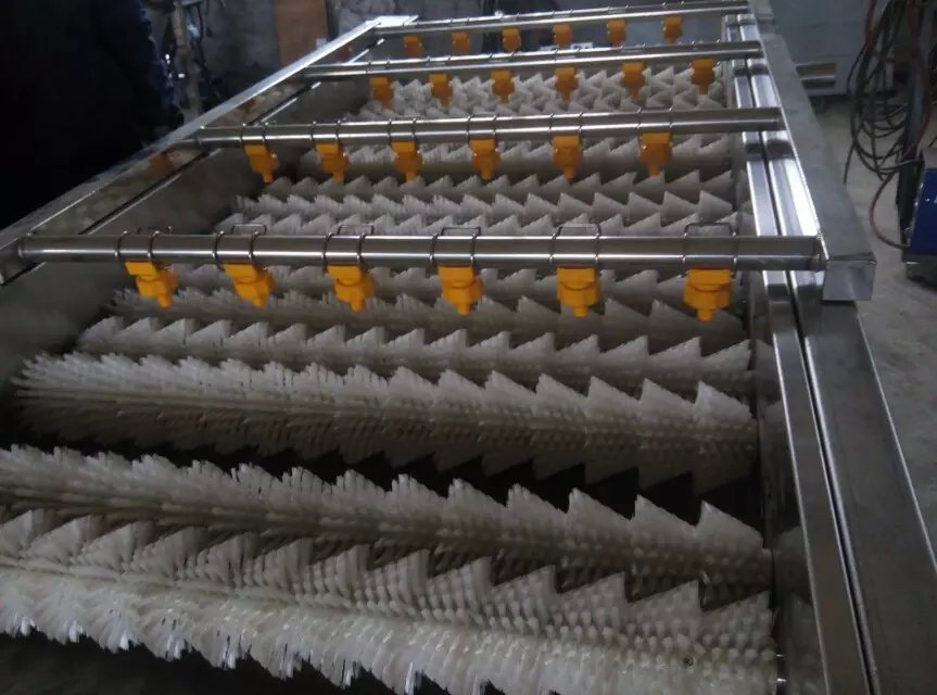d:凈菜加工設備-毛刷清洗機是通過毛輥的轉動,把水果上面的泥土清洗干凈,不損害表皮,使水果表面光潔如新。例如:草莓、梨、桃、土豆、枸杞等球狀的水果。