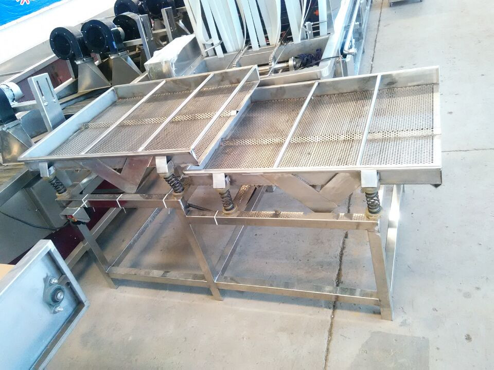 f:凈菜加工設備-挑選輸送機主要用于蔬菜后期的初處理,通過PVC輸送機運送的方式由工人在設備兩旁挑選,把清洗殺菌完的蔬菜上面的爛葉、干葉、異物、毛發等處理掉,也可用于前期處理,像葉類菜:青菜、油麥菜、生菜、菠菜、芥藍、茼蒿這一類的麻煩一些,摘除的部分多一些。